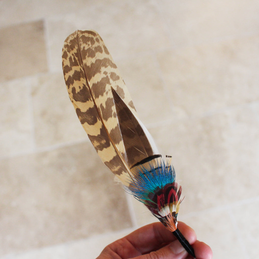 Cette broche est composée de plumes anciennes datant des années 30 de aigle et canard. Plumes récentes de faisan doré, paon, faisan de colchide et faisan lady amherst et faisan vénéré.