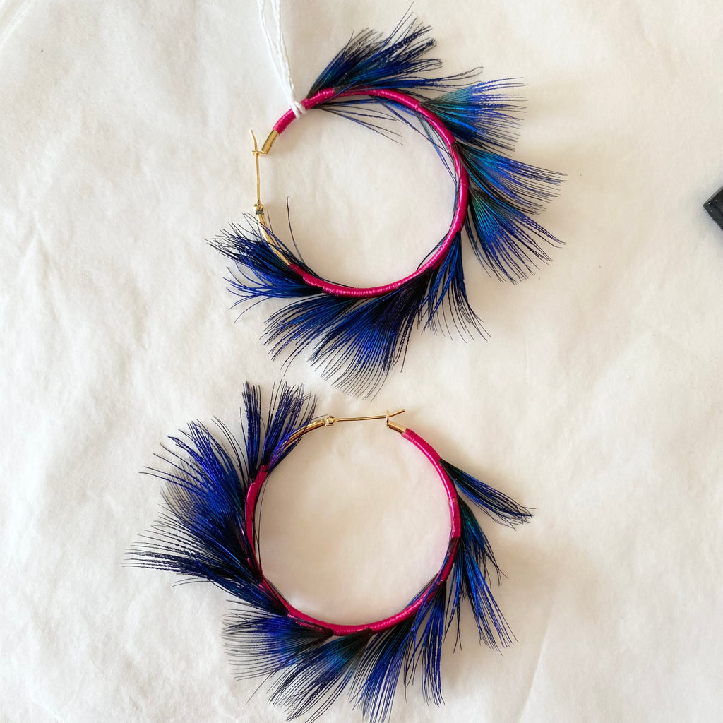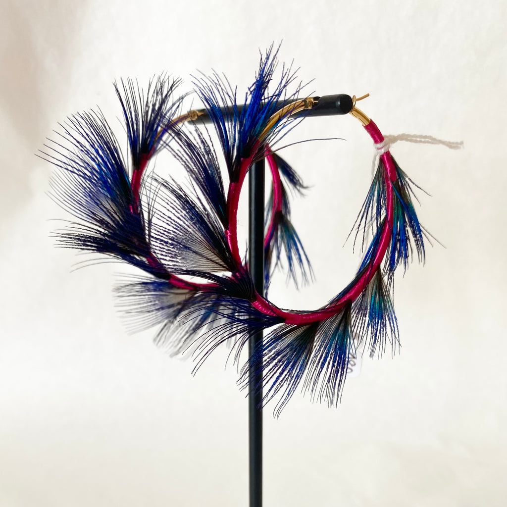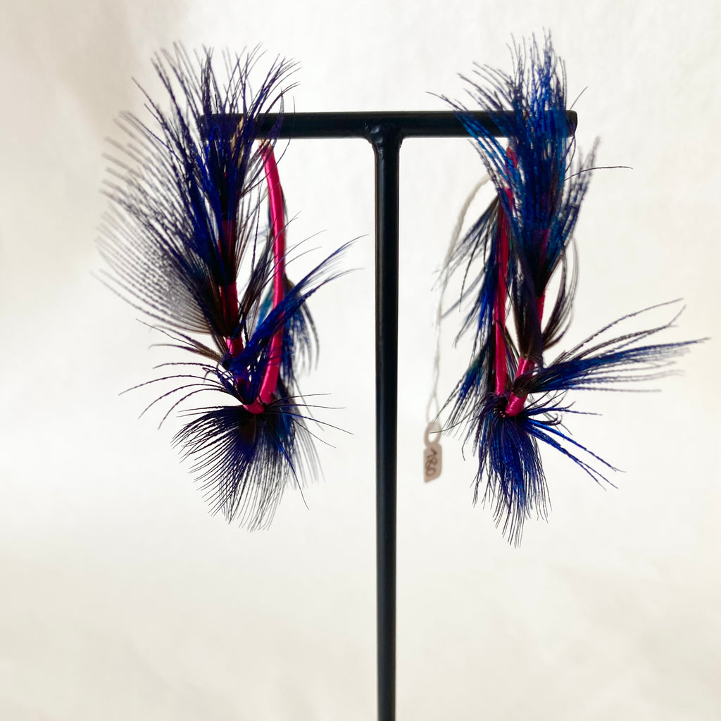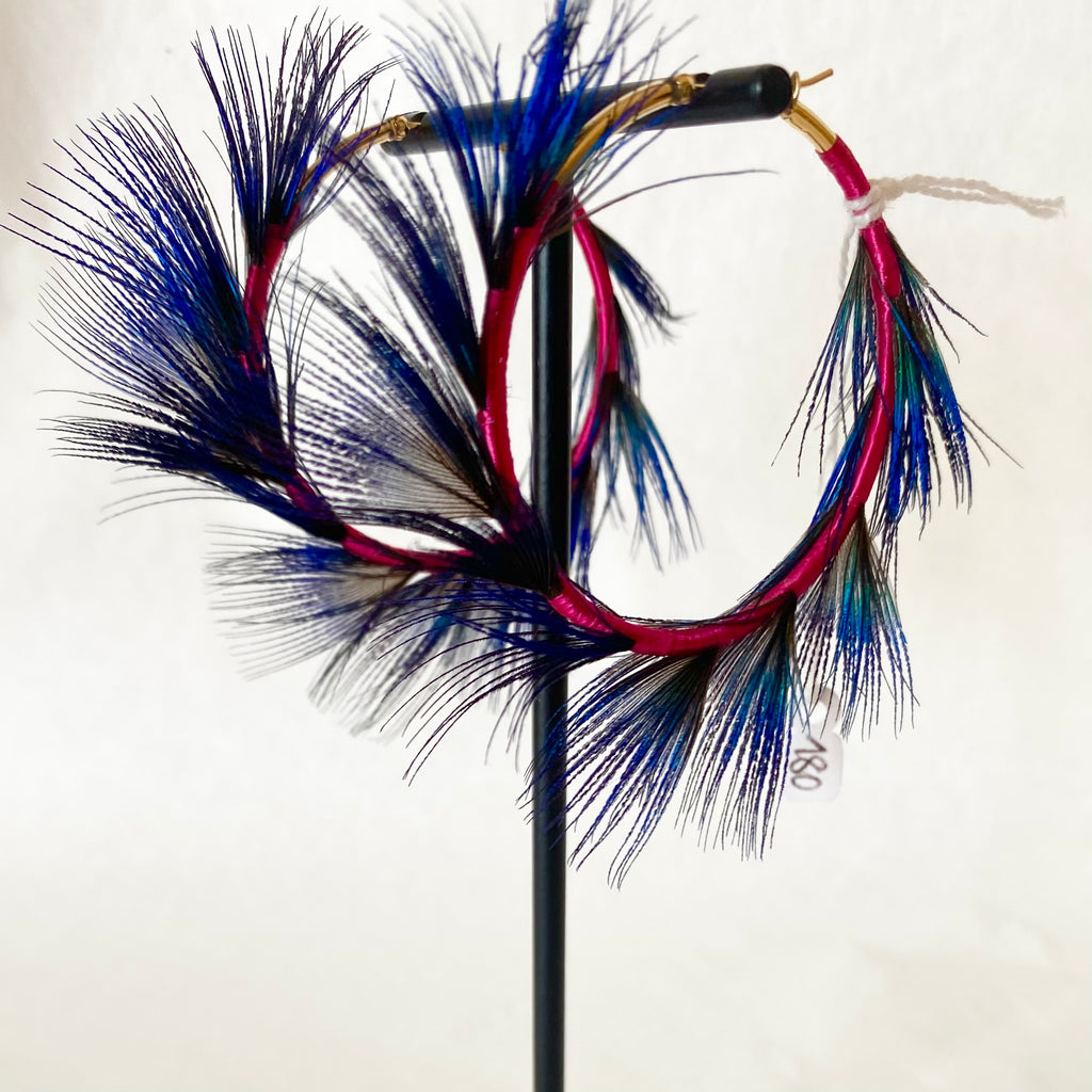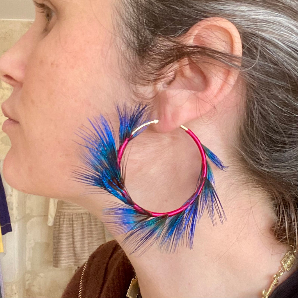 Ces boucles d’oreilles sont composées de plumes de paon. Fil de soie ancien et français chiné.