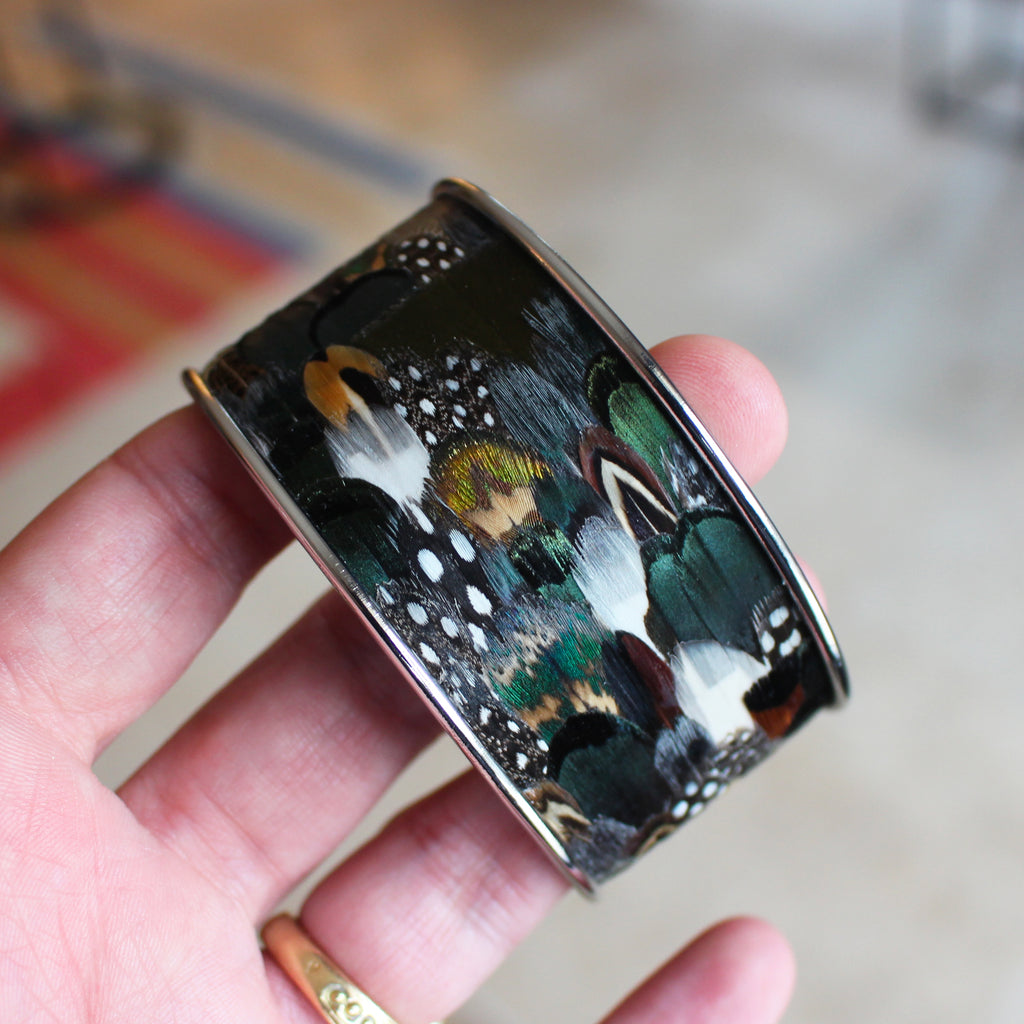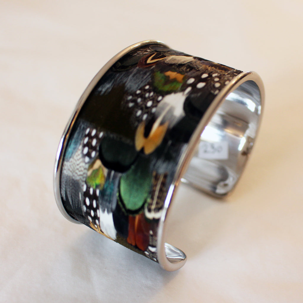 Cette manchette est composée de plumes de pintade, faisan de colchide, faisan lady amherst, canard, dinde et paon.